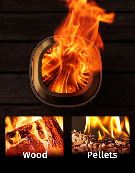 Brasa fire pit with unique Dual Fuel grate for pellets or wood chips. Includes free stand and silicone pad to protect surfaces. Versatile, durable, and stylish.
