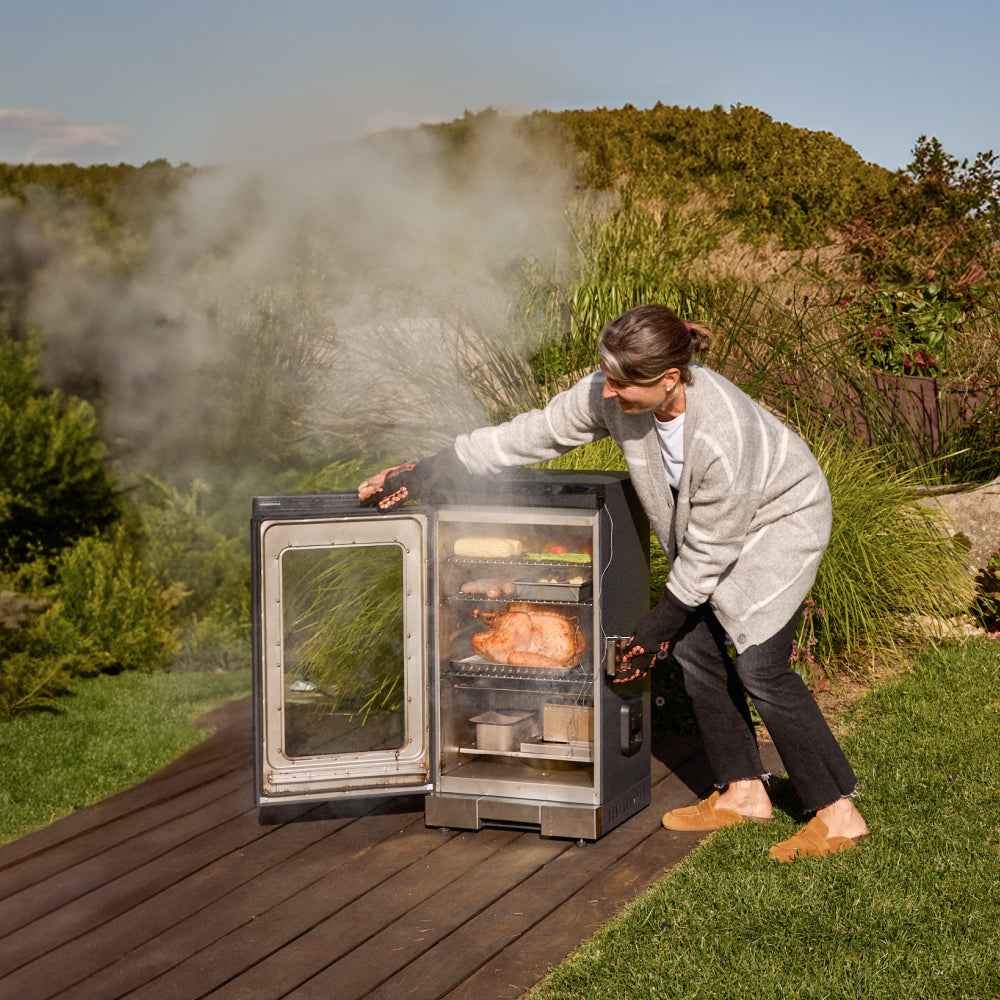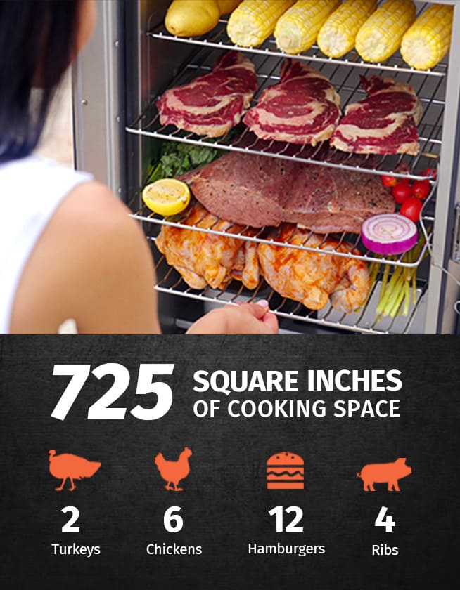 Enjoy smoky BBQ flavor with 725 Sq. In. electric smoker with glass door. Set it and forget it with digital controls, side loader, and unlock more recipes now!